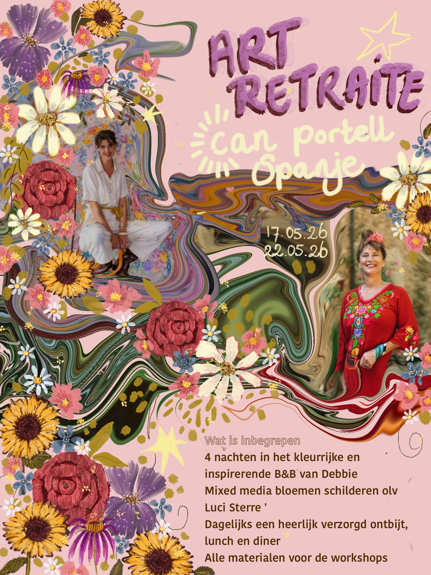 Voor wie? Voor iedereen die verlangt naar creativiteit, verbinding en een flinke dosis zonneschijn. Of je nu een ervaren kunstenaar bent of voor het eerst een penseel vasthoudt – je bent welkom.Laat je hart spreken, je handen creëren en je zintuigen verwennen. Dit wordt geen gewone retraite, maar een kleurrijke ode aan jezelf.Exclusiefvervoer naar en in Spanje. Mocht er behoefte aan zijn kunnen we carpool samenstellen.Hoe kleurrijker hoe liever en het liefst met een flinke hoeveelheid zon is een van mijn motto’s en daarom denk ik dat de match met Debbie en dus Can Portell made in heaven is!Schilderen doe ik altijd vanuit mijn hart, zonder voorbedacht plan. Ik laat mij leiden door de inspiratie om mij heen en het doek. Als autodidactisch kunstenaar is een ander motto van mij:als ik het kan, kan jij het ook!Dit is eigenlijk niet alleen een motto maar ook een belofte! Een van mijn favoriete momenten tijdens mijn workshops is het moment dat iemand die argwanend ‘ik kom voor de beleving/gezelligheid’ is binnengekomen, na afloop vol verwondering en trots naar diens eigen kunstwerk kijkt. Ik kan niet wachten om dit onder de Spaanse zon in Debbie’s prachtige B&B mogen te aanschouwenen samen op een kleurrijk avontuur te gaan.